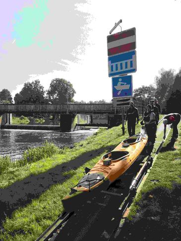 Die erste Pause war an der Große Tränke. Dort ist ein Wehr und wir mussten die Boote umsetzen. Das haben wir mit so einem besonderen Treidelfahrzeug auf Schienen gemacht. Am Wehr war auch eine Fischtreppe, die Ricarda uns gezeigt hat.